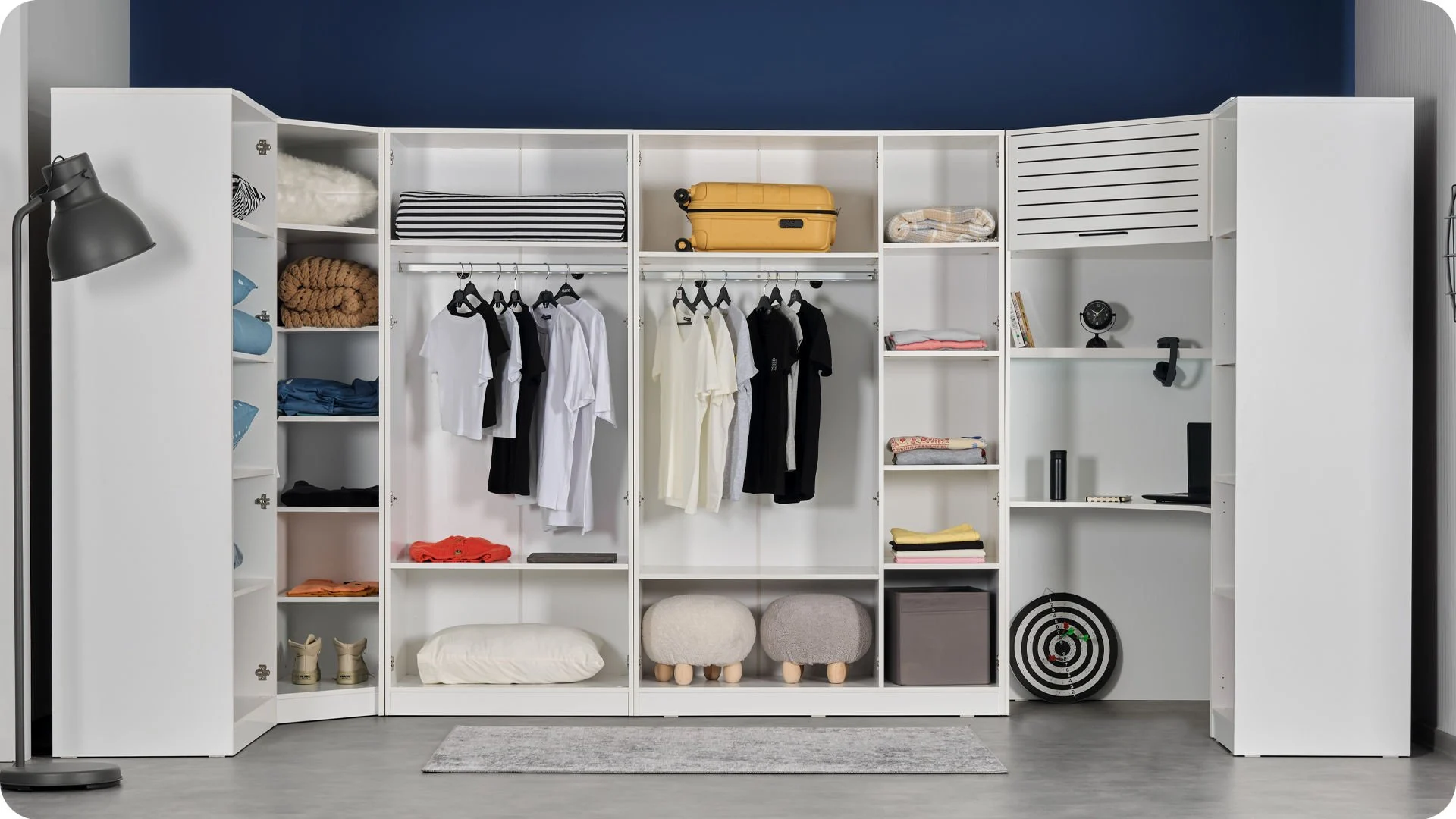 Minimalist tasarımlar, sade ve modern dekorasyon tercih edenler için ideal bir seçenektir. Temiz hatlara ve düz renk paletlerine sahip olan bu dolaplar, özellikle küçük alanlarda kullanım için uygundur. Açık raf sistemleri ve gizli dolap bölmeleri ile hem pratiklik hem de estetik sunar.